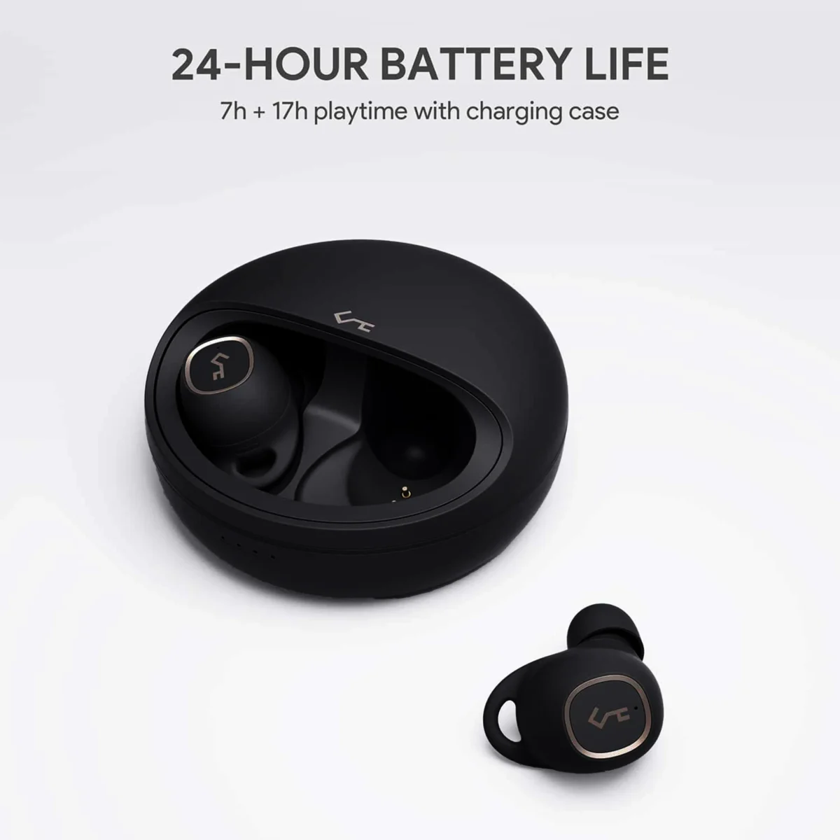 The buds provide 7 hours of continuous playback before needing a recharge, and the compact and stylish charging case has enough juice for 2 and a half full recharges.